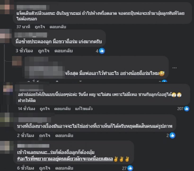 วันนึง ผญ จะไม่สน เพราะไม่มีเธอ ฉันกับลูกก็อยู่ได้ ฝากให้คิด, เข้าใจเลยแหละ ร่มก็ต้องถือ ลูกก็ต้องอุ้ม อะไรที่พยายามอยู่คนเดียวมักจะเหนื่อยเสมอ, ฯลฯ ในขณะเดียวกันก็มีชาวเน็ตบางส่วนเห็นต่าง บอกว่า บางทีเรื่องบางเรื่องมันอาจจะไม่ใช่อย่างที่เราเห็นก็ได้ครับ