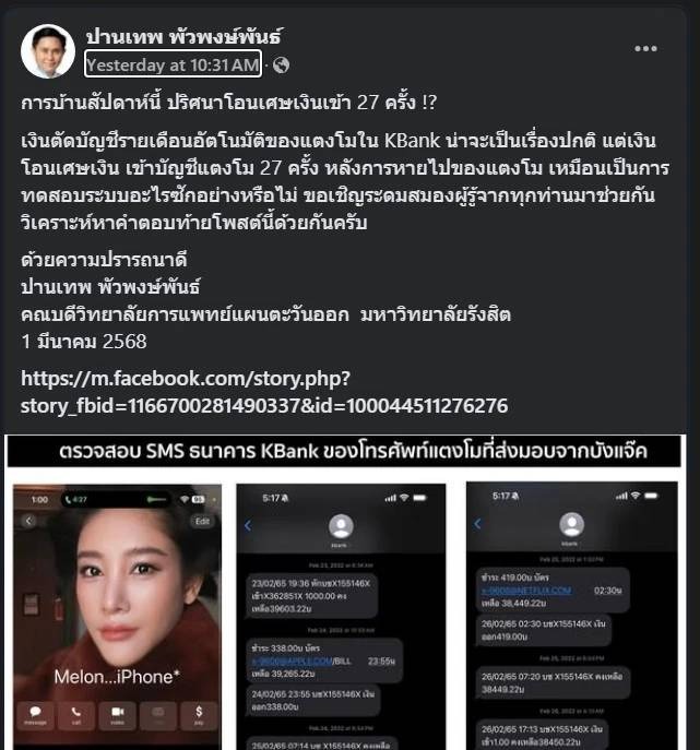 ปริศนาใหม่ในคดีแตงโม! อ.ปานเทพ พัวพงษ์พันธ์ ออกมาเผยข้อมูลล่าสุดผ่านเฟซบุ๊กส่วนตัว ระบุว่า พบรายการเงินโอนเข้าบัญชีของแตงโมถึง 27 ครั้ง หลังจากเธอเสียชีวิต สร้างข้อสงสัยว่าเป็นการทดสอบระบบบางอย่างหรือไม่