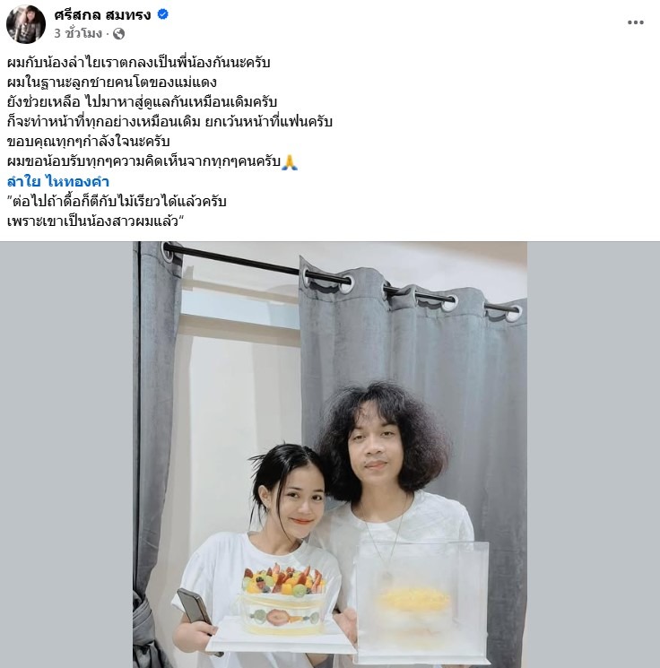 ปุ้ยระบุว่า “ผมกับน้องลำไยเราตกลงเป็นพี่น้องกันนะครับ ผมในฐานะลูกชายคนโตของแม่แดง ยังช่วยเหลือ ไปมาหาสู่ดูแลกันเหมือนเดิมครับ ก็จะทำหน้าที่ทุกอย่างเหมือนเดิม ยกเว้นหน้าที่แฟนครับ ขอบคุณทุกกำลังใจนะครับ ต่อไปถ้าดื้อก็ตีกับไม้เรียวได้แล้วครับ เพราะเขาเป็นน้องสาวผมแล้ว” ซึ่งโพสต์ดังกล่าวได้รับความสนใจจากแฟนคลับและคนในวงการบันเทิงเป็นจำนวนมาก