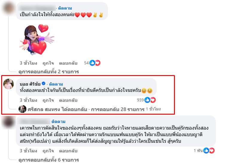 หนึ่งในคนที่เข้ามาแสดงความคิดเห็นก็คือ บอย ศิริชัย หมอลำชื่อดังและสามีของ แอน อรดี โดยบอยได้คอมเมนต์ให้กำลังใจว่า “ทั้งสองคนเข้าใจกันก็เป็นเรื่องที่น่ายินดีครับ เป็นกำลังใจให้นะครับ” แสดงถึงความเคารพในการตัดสินใจของทั้งคู่ และให้กำลังใจอย่างอบอุ่น