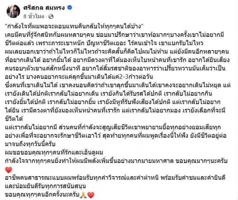 เขาพยายามยื้อทุกอย่างยอมเสียทุกอย่างเพื่อที่จะอยากจะรักษาชีวิตเอาไว้ สุดท้ายทุกคนที่ผมพูดเรื่องนี้ให้ฟัง ยังมีชีวิตอยู่ต่อมาจนถึงทุกวันนี้ครับ ผมขอขอบคุณทุก ๆ คนที่รักและเอ็นดูผม กำลังใจจากทุก ๆ คนยิ่งทำให้ผมมีพลังเพิ่มขึ้นอย่างมากมายมหาศาล ขอบคุณมาก ๆ นะครับ
