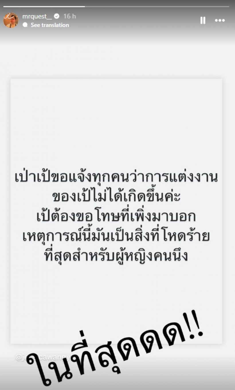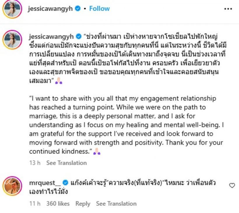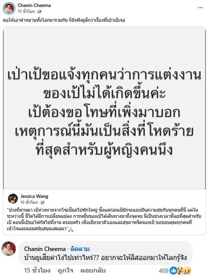 และมีแผนจะจัดงานแต่งงานในช่วงต้นปีนี้ ในโพสต์ดังกล่าว เป่าเป้ระบุว่า “เป่าเป้ ขอแจ้งทุกคนว่าการแต่งงานของ เป้ ไม่ได้เกิดขึ้นค่ะ เป้ ต้องขอโทษที่เพิ่งมาบอก เหตุการณ์นี้เป็นช่วงเวลาที่ยากลำบากที่สุดสำหรับ เป้” เธอยังกล่าวเพิ่มเติมว่า ช่วงที่ผ่านมาเธอห่างหายจากโซเชียล