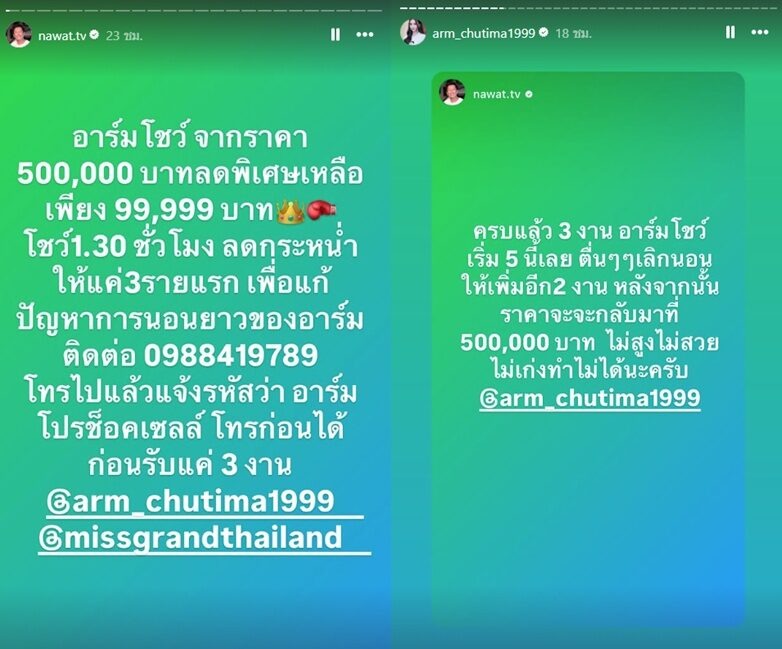 ล่าสุด บอสณวัฒน์ได้โพสต์ผ่านสตอรี่อินสตาแกรมส่วนตัว ประกาศปรับราคาค่าตัวของอาม ชุติมา ในโชว์เต็มวงจาก 500,000 บาท เหลือเพียง 99,999 บาท สำหรับ 3 งานแรก โดยระบุว่าเป็นโปรโมชันพิเศษที่ต้องแจ้งรหัสว่า อาร์มโปรพิเศษ ขณะติดต่อ