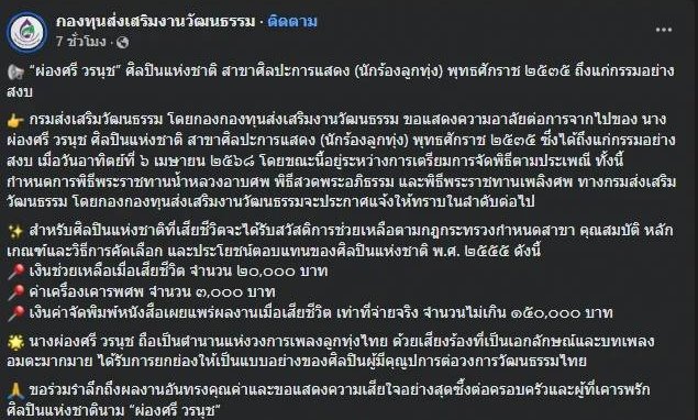 ประเทศไทยได้สูญเสียบุคคลสำคัญในวงการดนตรีลูกทุ่ง “แม่ผ่องศรี วรนุช” ผู้เป็นทั้งศิลปินรุ่นบุกเบิกและได้รับการยกย่องเป็นศิลปินแห่งชาติ สาขาศิลปะการแสดง (เพลงไทยลูกทุ่ง – ขับร้อง) ประจำปี พ.ศ. 2535 โดยได้จากไปอย่างสงบในวัย 85 ปี หลังจากเข้ารับการดูแลด้านสุขภาพ