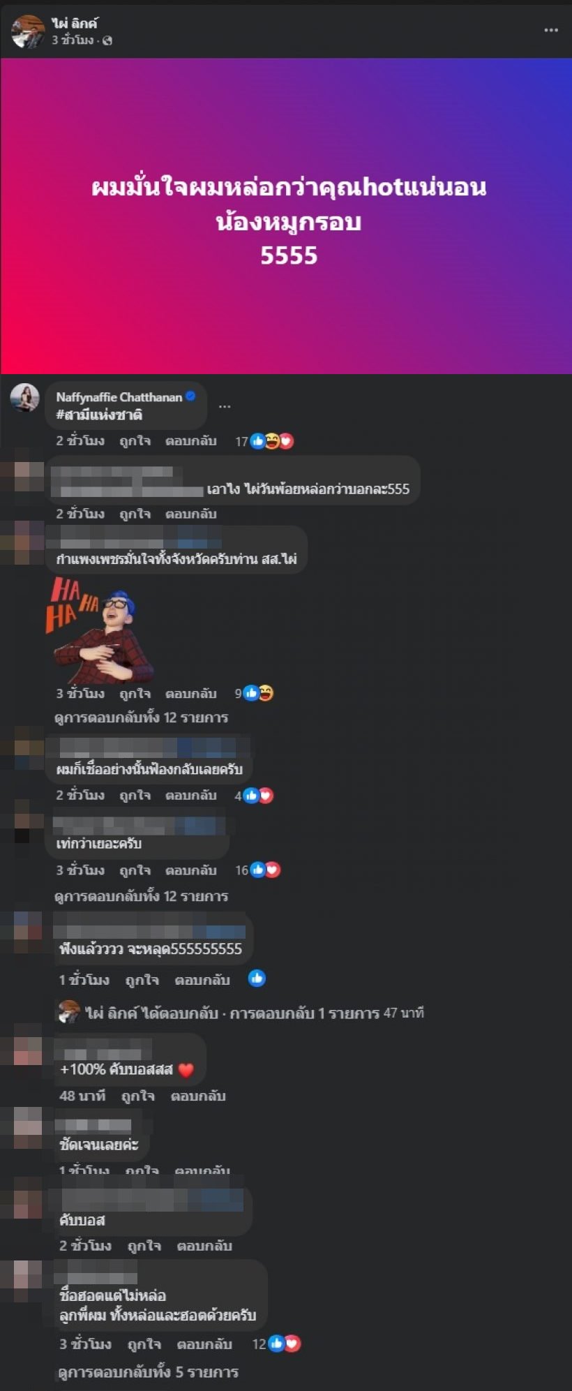 คนที่ภายนอกอาจธรรมดา ก็สามารถมีนิสัยที่ดีคล้าย “พี่ไผ่ วันพอยท์” ได้เช่นกัน ล่าสุด วันที่ 8 เมษายน ไผ่ ลิกค์ สมาชิกสภาผู้แทนราษฎร ได้ออกมาแสดงความเห็นผ่านเฟซบุ๊กส่วนตัวในลักษณะเป็นกันเอง ระบุว่า “ผมมั่นใจว่าผมดูดีกว่าคุณ hot แน่นอนครับ น้องหมูกรอบ 5555”