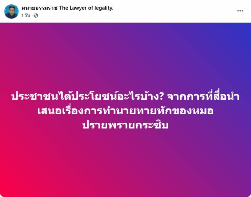จากกรณีที่ก่อนหน้านี้ทางด้าน หมอปลาย พรายกระซิบ ได้ออกมาทำนายเรื่องราวต่าง ๆ ที่กำลังจะเกิดขึ้นในประเทศไทย มีทั้งตรง และ ไม่ตรงบ้าง ล่าสุดทางด้าน ทนายธรรมราช ได้ออกมาโพสต์ข้อความผ่านทางเฟซบุ๊ก ทนายธรรมราช The Lawyer of legality.