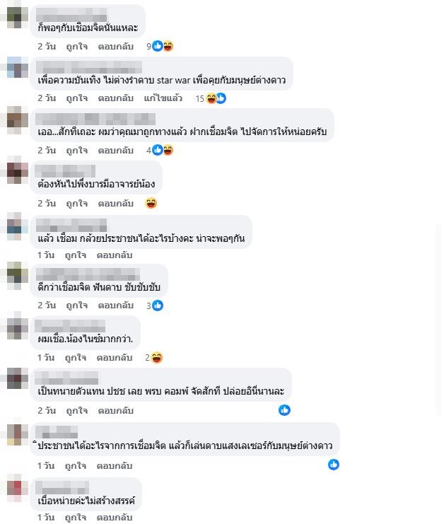 แล้วก็เล่นดาบแสงเลเซอร์กับมนุษย์ต่างดาว, ได้ตระหนักถึง การป้องกัน การระมัดระวัง เป็นต้น เห็นว่า, เบื่อหน่ายค่ะ ไม่สร้างสรรค์, ได้เห็นเพจนี้เอามาเป็นประเด็นไงไม่เหงาๆ, จริง ได้แต่ความ เห้อ จริงไม่จริง จะพูดทำไม คนที่เชื่อ เขาก็ไม่สบายใจ, ได้ความบันเทิงครับ, ฯลฯ