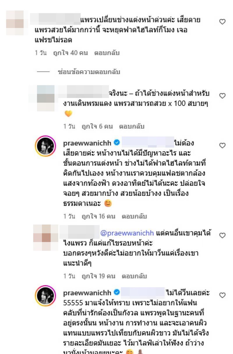 ไม่อยากให้แฟนคลับที่น่ารักต้องเป็นกังวล แพรว พูดในฐานะคนที่อยู่ตรงนั้น หน้างาน การทำงาน และจะเอาคนผิวแทนแบบ แพรว ไปเทียบกับคนผิวขาว มันไม่ได้จริง รายละเอียดมันเยอะ ไว้มาไลฟ์เล่าให้ฟัง ถ้าว่างมานั่งเม้าท์มอยนะคะ”