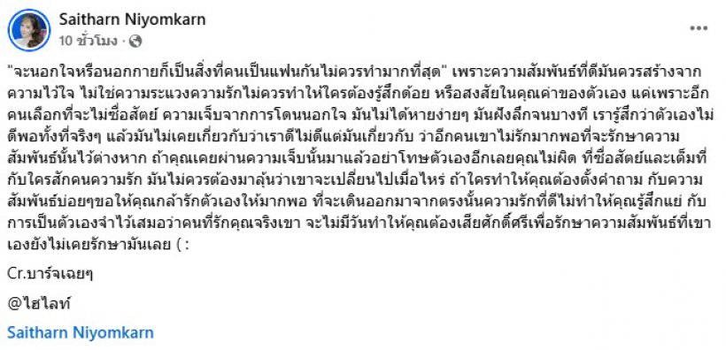 พร้อมข้อความถาม แฟนหนุ่ม ว่า เอาแบบนี้ไหม (อิโมจิขำ) สาวต่าย ยังแชร์โพสต์ถึงเรื่องการนอกใจว่า “จะนอกใจหรือนอกกายก็เป็นสิ่งที่คนเป็นแฟนกันไม่ควรทำมากที่สุด เพราะความสัมพันธ์ที่ดีมันควรสร้างจากความไว้ใจ ไม่ใช่ความระแวงความรักไม่ควรทำให้ใครต้องรู้สึกด้อย