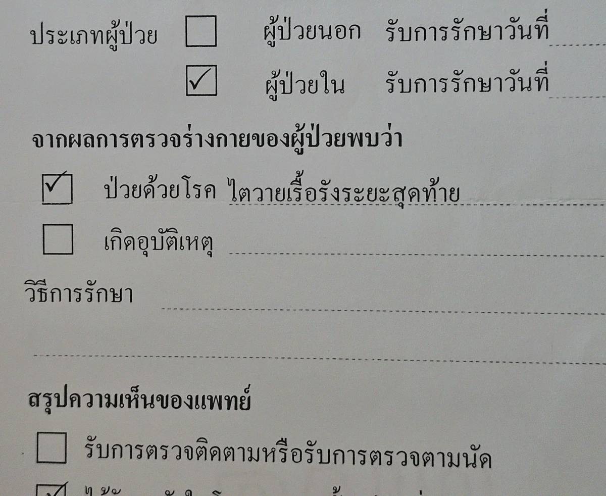 ปัสสาวะได้ปกติ และอวัยวะอื่น ๆ ยังแข็งแรง ปอด ตับ ต่อมต่าง ๆ ปกติ ความดันปกติ เบาหวานปกตินี่อาจเป็นมรดกตกทอดจากคุณแม่ก็เป็นได้ ข้อดีในที่นี้คือ 7 ปีที่ผ่านมา ทุกกระบวนการของคุณแม่ ผมเป็นคนดำเนินการ จึงทำให้ทราบขั้นตอนเป็นอย่างดี เกี่ยวกับผู้ป่วยโรคไต