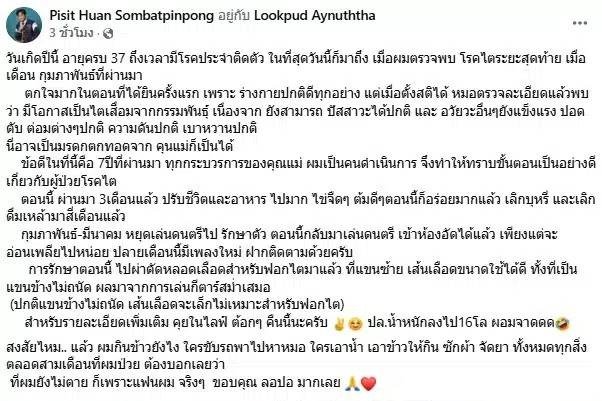 เป็นอีกหนึ่งเรื่องราวที่ทำเอาแฟนคลับหลายคนใจหาย เมื่อ “ฮั้ว-พิสิฐ สมบัติพิณพง” มือกีตาร์มากฝีมือจากวง Nap a Lean เผยข่าวช็อกผ่านทางเฟซบุ๊กส่วนตัว Pisit Huan Sombatpinpong ในวันคล้ายวันเกิดอายุครบ 37 ปีว่า “วันเกิดปีนี้ อายุครบ 37 ถึงเวลามี