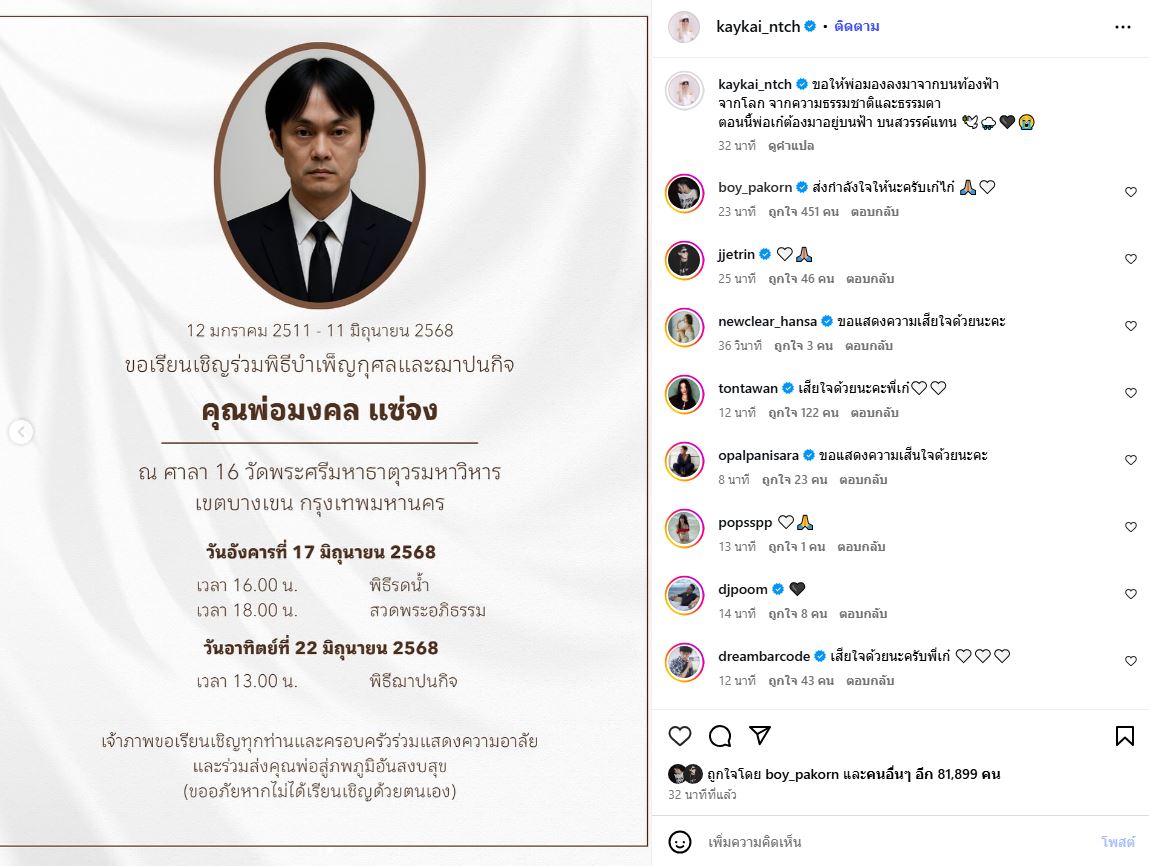 ล่าสุด เก๋ไก๋ โพสต์กำหนดการ คุณพ่อ ผ่านอินสตาแกรมส่วนตัว พร้อมระบุข้อความว่า “ขอให้พ่อมองลงมาจากบนท้องฟ้า จากโลก จากความธรรมชาติและธรรมดา ตอนนี้ พ่อเก๋ ต้องมาอยู่บนฟ้า บนสวรรค์แทน” ท่ามกลางคอมเมนต์ส่งกำลังใจจากเพื่อนร่วมวงการ และแฟนคลับ