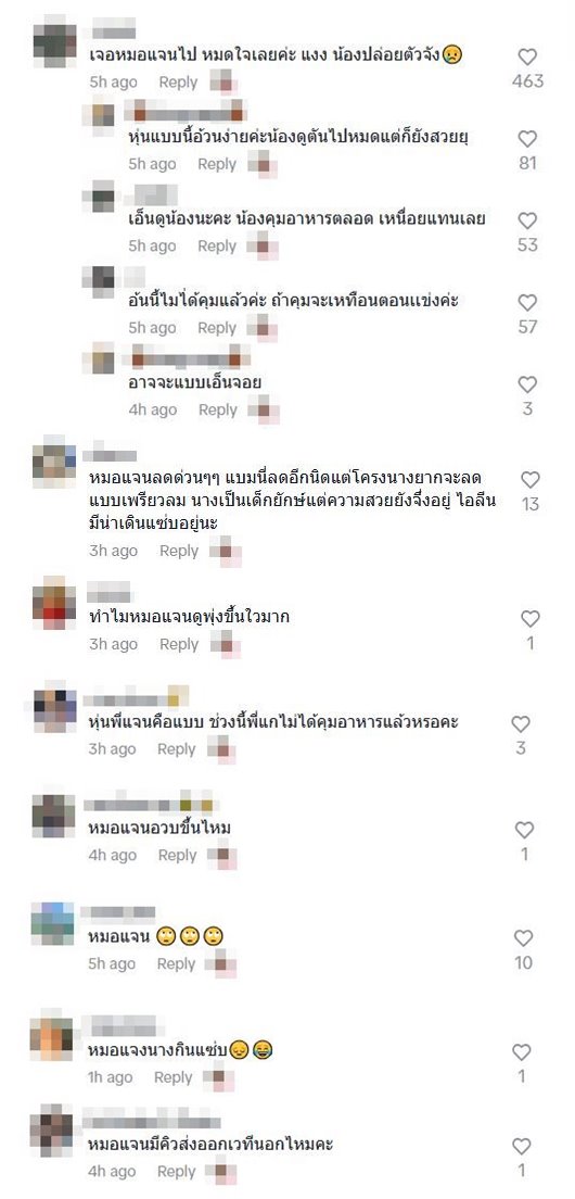 เช่น เจอ หมอแจน ไป หมดใจเลยค่ะ แงง น้องปล่อยตัวจัง, หุ่นแบบนี้อ้วนง่ายค่ะ น้องดูตันไปหมด แต่ก็ยังสวยอยู่, เอ็นดูน้องนะคะ น้องคุมอาหารตลอด เหนื่อยแทนเลย, อ้นนี้ไม่ได้คุมแล้วค่ะ ถ้าคุมจะเหมือนตอนเเข่งค่ะ, อาจจะแบบเอ็นจอย, หมอแจน ลดด่วนๆๆ