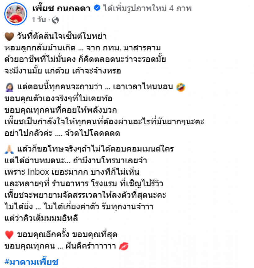 ทำเอาแฟนคลับหลายคนช็อกไปตาม ๆ กัน เมื่อล่าสุด เพี๊ยช กนกลดา หรือ มาดามเพี๊ยช อดีตนางงาม Miss Body Perfect นางสาวไทย 2552 และนักแสดงจาก ผู้หญิง 5 บาป 2 ได้ออกมาโพสต์ภาพของตัวเองพร้อมเขียนแคปชั่นว่า “วันที่ตัดสินใจเซ็นใบหย่า