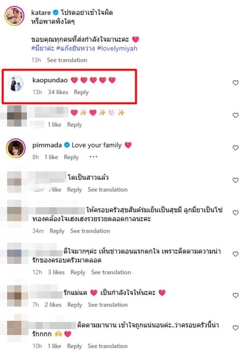 น้องมียา รักครอบครัวที่สุด, ให้ครอบครัวสุขสันต์ร่มเย็นเป็นสุขมีลูก มียา เป็นโซ่ทองคล้องใจเฮง ๆ รวย ๆ ตลอดกาลนะคะ, ดีใจมาก ๆ ค่ะ เห็นข่าวตอนแรกตกใจ เพราะติดตามความน่ารักของครอบครัวมาตลอด, ฯลฯ
