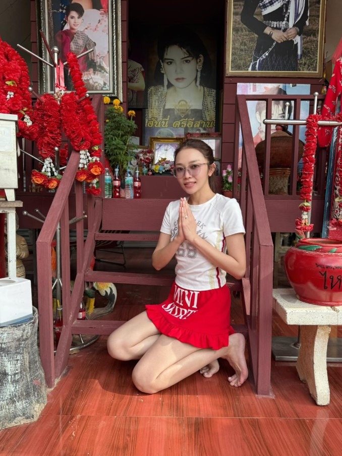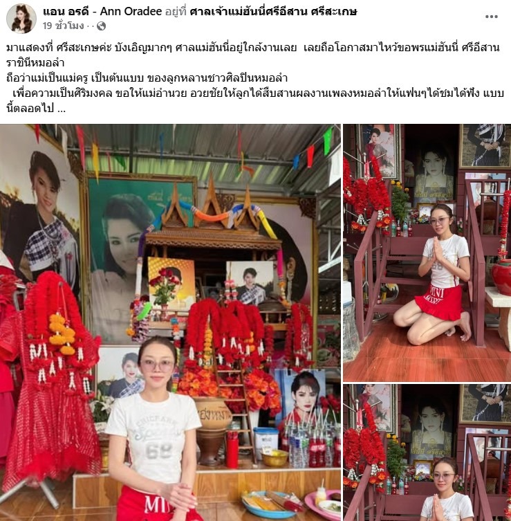 แอนโพสต์ภาพขณะไหว้ศาล พร้อมเล่าความรู้สึกว่าได้มากราบแม่ครูผู้เป็นแบบอย่างของศิลปินหมอลำ เพื่อความเป็นสิริมงคลและขอพรให้สามารถสืบสานงานศิลป์ต่อไปให้แฟนเพลงได้ชมอย่างต่อเนื่อง