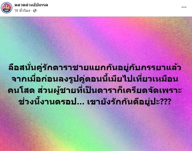 ทำเอาชาวเน็ตสวมบทบาทนักสืบอีกครั้ง หลังล่าสุดช่วงกลางดึกของวันที่ 7 กรกฎาคม 2568 ทางเพจเฟซบุ๊กชื่อดังอย่าง “ตลาดล่างอัปเกรด” ได้ออกมาโพสต์ข้อความชวนสงสัย ออกคำใบ้ชัดเจนว่า “ลือสนั่น คู่รักดาราชายแยกกันอยู่กับภรรยาแล้ว จากเมื่อก่อนลงรูปคู่