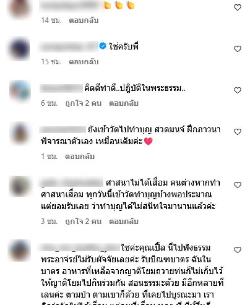 พร้อมแคปชั่นว่า “บวชมาแล้ว 2 ครั้ง ไม่ได้จะเข้าข้างพระเลว แต่พระสงฆ์ดี ๆ มีอยู่จริง สงสารพระพุทธเจ้า สาธุ” ซึ่งงานนี้ก็มีชาวเน็ตเข้ามาคอมเมนต์จำนวนมาก อาทิ ใช่ครับพี่, คิดดีทำดีปฏิบัติในธรรม, ยังเข้าวัดไปทำบุญ สวดมนต์ ฝึกภาวนา พิจารณาตัวเอง เหมือนเดิมค่ะ,