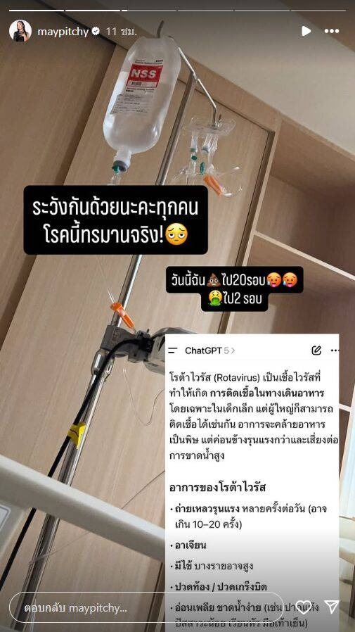 ได้โพสต์ภาพขณะนอนพักรักษาตัวอยู่ที่โรงพยาบาลลงในสตอรี่อินสตาแกรมส่วนตัว พร้อมระบุข้อความเตือนทุกคนถึงไวรัสตัวนี้ว่า “ระวังกันด้วยนะคะทุกคน โรคนี้ทรมานจริง” พร้อมแนบข้อมูลรายละเอียดและอาการที่เกิดจากโรคนี้จากการค้นหาใน ChatGPT ให้แฟนคลับ