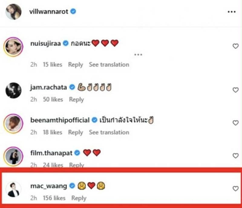 ก็ได้เข้ามาคอมเมนต์ให้กำลังใจเป็นอีโมจิทำท่ากอดและหัวใจด้วย ถึงแม้ว่าเจ้าตัวยังไม่ได้ออกมาชี้แจงว่า เบื้องหลังโพสต์นี้เกิดจากอะไร แต่ก็กลายเป็นประเด็นร้อนในโลกออนไลน์ ที่ทำให้แฟนๆ ต่างเฝ้าจับตาและรอคอยคำตอบจากเธอด้วยความห่วงใย