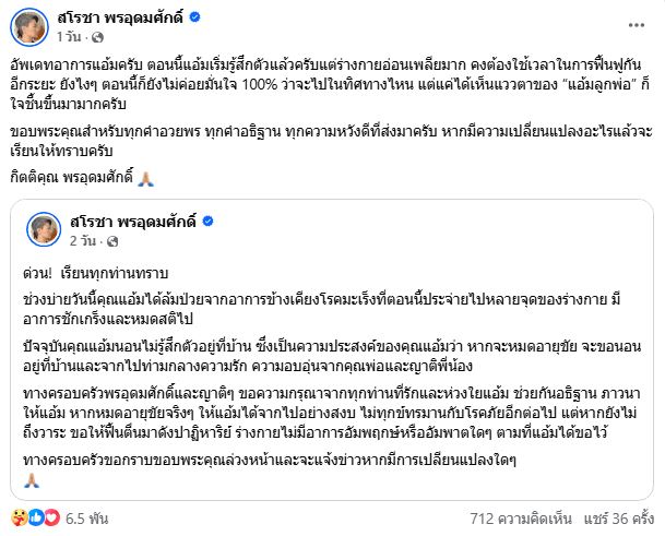 แต่หากยังไม่ถึงวาระ ขอให้ฟื้นตื่นมาดังปาฏิหาริย์ ร่างกายไม่มีอาการอัมพฤกษ์หรืออัมพาตใดๆ ตามที่ แอ้ม ได้ขอไว้ ทางครอบครัวขอกราบขอบพระคุณล่วงหน้าและจะแจ้งข่าวหากมีการเปลี่ยนแปลงใดๆ” โดยก่อนหน้านี้เมื่อปี 2561 น.ส.สโรชา ได้แจ้งว่าตนเองป่วยเป็นมะเร็ง