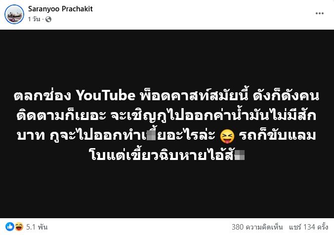 กลายเป็นประเด็นร้อนในโลกโซเชียล หลังจาก บีม ศรัณยู โพสต์ข้อความระบายเกี่ยวกับคนดังรายหนึ่ง โดยเล่าว่ามีการติดต่อให้ไปออกรายการ แต่กลับไม่มีแม้แต่ค่ารถ ทั้งที่อีกฝ่ายขับรถหรูราคาแพง สร้างเสียงวิพากษ์วิจารณ์และชวนให้ชาวเน็ตคาดเดากันว่าเป็นใคร