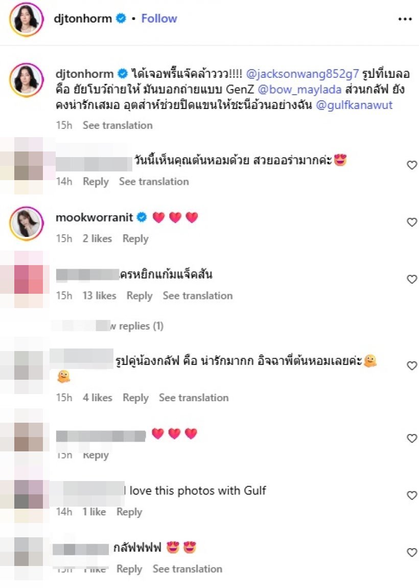 รูปที่เบลอคือ ยัยโบว์ ถ่ายให้ มันบอกถ่ายแบบ GenZ @bow_maylada ส่วน กลัฟ ยังคงน่ารักเสมอ อุตส่าห์ช่วยปิดแขนให้ชะนีอ้วนอย่างฉัน @gulfkanawut” แต่งานนี้ชาวเน็ตต่างโฟกัสไปที่ สาวต้นหอม ที่พากันคอมเมนต์ชมความสวย ต่างบอกว่าตัวจริงออร่ามาก อาทิ