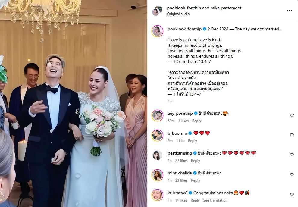 แต่สิ่งที่ทัชใจและกลายเป็นความหมายของความรักอันลึกซึ้งที่กวาดยอดไลก์ไปอย่างถล่มทลาย คือแคปชั่นของ สาวปุ๊กลุก ที่หยิบยกถ้อยคำจากคัมภีร์ไบเบิล มานิยามเส้นทางรักของพวกเขาว่า “ความรักอดทนนาน ความรักมีเมตตา ไม่จดจำความผิด ความรักทนได้ทุกอย่าง เชื่ออยู่เสมอ หวังอยู่เสมอ และอดทนอยู่เสมอ” ซึ่งเป็นข้อความที่ทรงพลังและสะท้อนถึงการประคับประคองชีวิตคู่ได้อย่างงดงามที่สุด