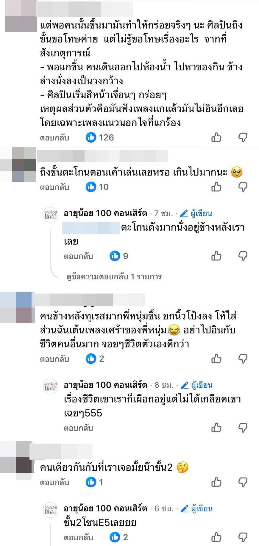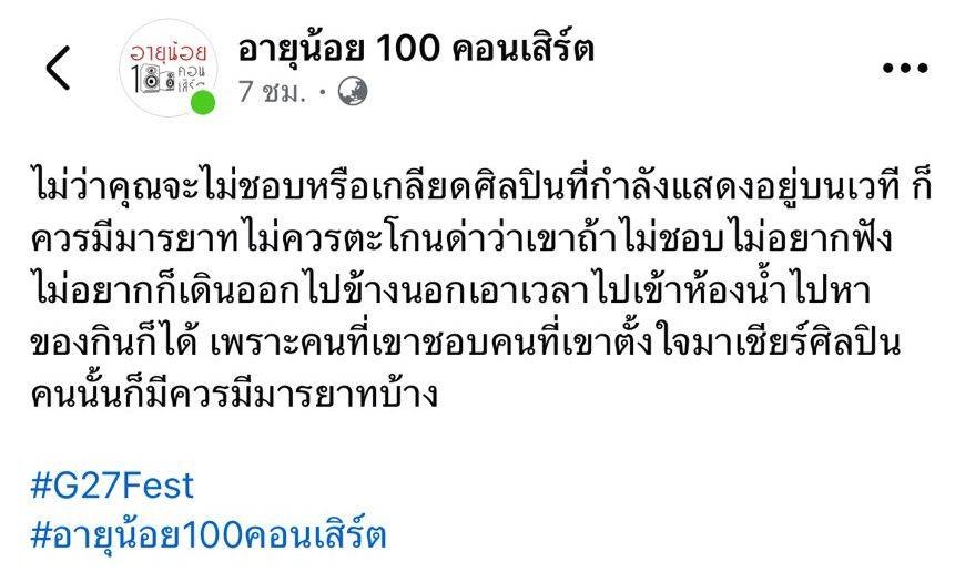 เรื่องนี้ร้อนถึงเพจรีวิวคอนเสิร์ตชื่อดังอย่าง “อายุน้อย 100 คอนเสิร์ต” ที่ต้องออกมาโพสต์ดึงสติผู้ชมชุดใหญ่ โดยระบุข้อความฟาดจุกๆ ว่า ไม่ว่าคุณจะเกลียดหรือไม่ชอบศิลปินที่กำลังโชว์อยู่บนเวทีแค่ไหน สิ่งสำคัญที่สุดคือการมี “มารยาท” หากไม่อยากฟังก็แค่ลุกเดินออกไปเข้าห้องน้ำหรือหาอะไรกินข้างนอก ดีกว่ามาตะโกนด่าทอทำลายบรรยากาศ เพราะยังมีแฟนคลับอีกจำนวนมากที่เขาตั้งใจซื้อบัตรมาเชียร์ศิลปินคนนี้ และควรเคารพสิทธิ์ซึ่งกันและกัน