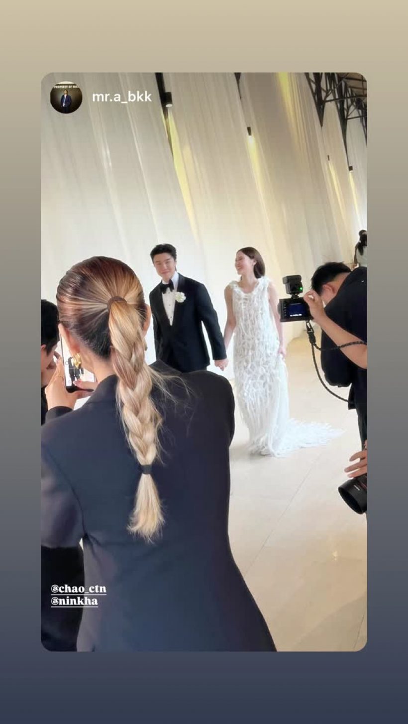สำหรับบรรยากาศภายในงาน ถูกเนรมิตออกมาในสไตล์เรียบหรูแต่เปี่ยมไปด้วยความอบอุ่นสะท้อนตัวตนของเจ้าบ่าวเจ้าสาวได้เป็นอย่างดี โดยหนุ่มเชาปรากฏตัวในชุดสูทสุดเนี้ยบสมฐานะนายแบบแถวหน้า ขณะที่สาวนิ้งสวยสง่าสะกดทุกสายตาในชุดเจ้าสาวสีขาวสะอาดตา ทั้งคู่คอยดูแลและส่งสายตาหวานซึ้งให้กันตลอดพิธีการ ทำเอาแขกในงานอิ่มเอมใจไปกับความรักที่สุกงอมของทั้งคู่