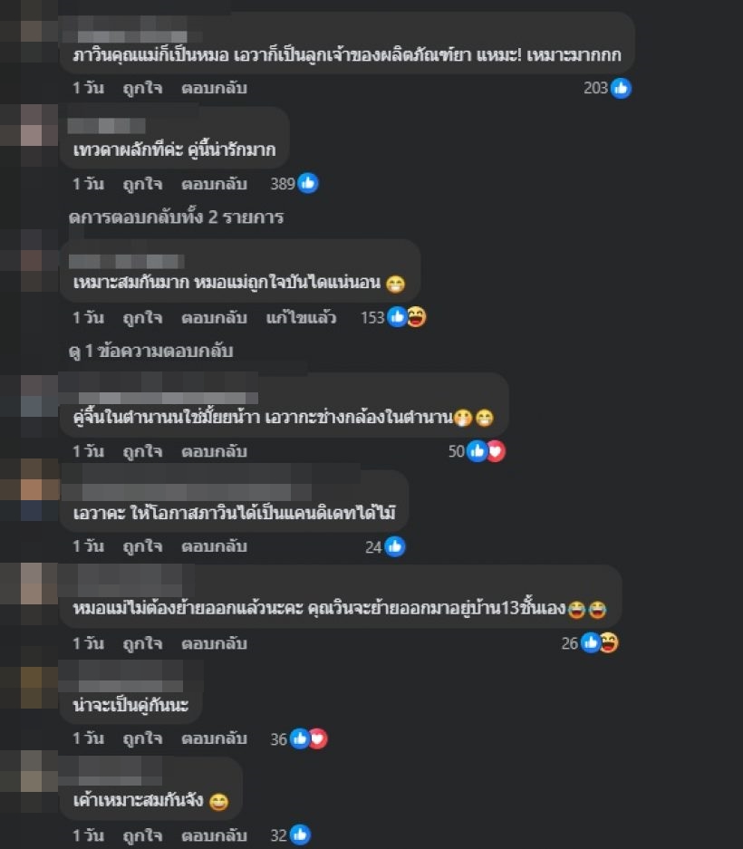 และคู่รัก (ในฝัน) ที่กำลังถูกจับตามองที่สุดในนาทีนี้ก็คือ “เอวา – ปวรวรรณ วีระภุชงค์” สาวสวยรวยเก่งแห่งอาณาจักรไทยนครพัฒนา กับหนุ่มหล่อดีกรี CEO “วินท์ – ภาวินท์” ลูกชายสุดรักของ “หมอแม่ พญ.พิศศรี” จากเพจดัง Dr.Mom แม้ตอนนี้จะยังไม่มีการคอนเฟิร์มว่าความสัมพันธ์เดินหน้าไปถึงระดับไหน แต่แค่เห็นภาพความน่ารักที่ “หมอแม่” ไฟเขียวผ่านตลอดขนาดนี้ แฟนๆ อาจมีลุ้นก็ได้