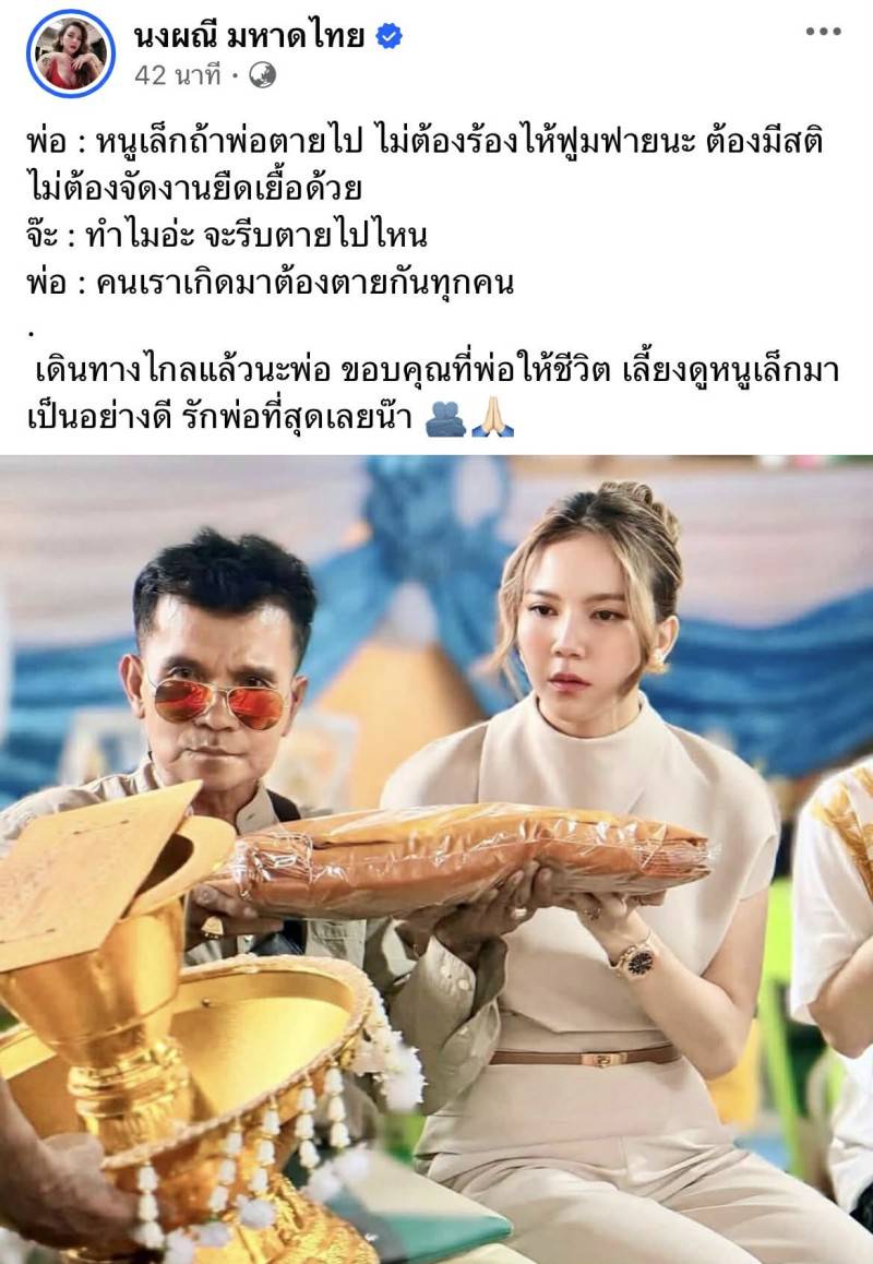 ในวันที่หัวใจแตกสลาย “จ๊ะ” ได้โพสต์ข้อความผ่านเฟซบุ๊กอำลาคุณพ่อด้วยบทสนทนาที่อ่านแล้วน้ำตาซึม โดยคุณพ่อเคยสอนไว้ล่วงหน้าอย่างมีสติว่า “ถ้าพ่อจากไป ไม่ต้องร้องไห้ฟูมฟายนะ ต้องมีสติไม่ต้องจัดงานยืดเยื้อด้วย เพราะคนเราเกิดมาต้องจากไปทุกคน” ซึ่ง จ๊ะ ก็ได้ทิ้งท้ายคำลาถึงพ่อผู้ให้ชีวิตว่า “ขอบคุณที่พ่อให้ชีวิต เลี้ยงดูหนูเล็กมาเป็นอย่างดี รักพ่อที่สุดเลยน๊า” ท่ามกลางบรรยากาศความโศกเศร้าของเพื่อนพ้องในวงการบันเทิงที่ต่างเข้ามาโอบกอดและส่งกำลังใจให้เธอผ่านช่วงเวลาที่แสนเปราะบางนี้ไปให้ได้