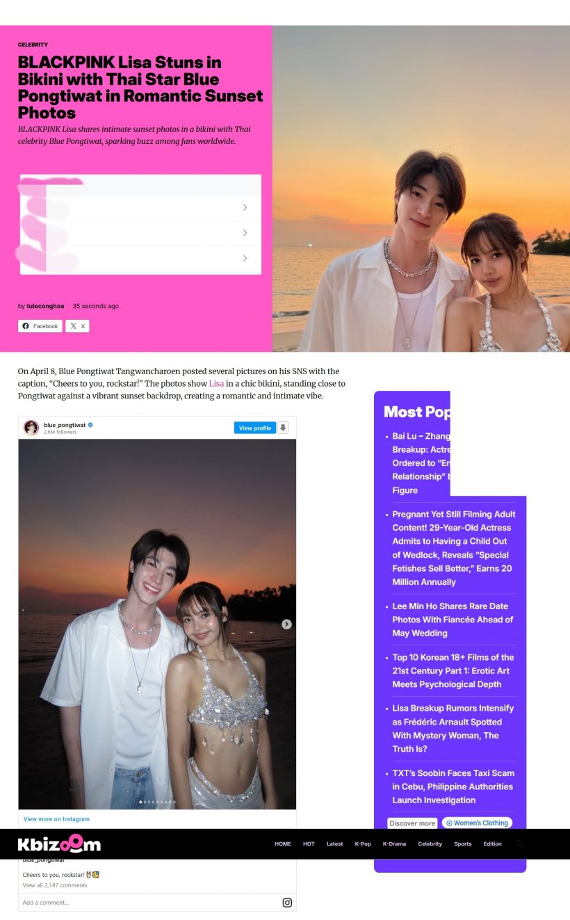 ชนวนเหตุของความฮือฮาครั้งนี้มาจากภาพสุดชิคที่ลิซ่าถ่ายคู่กับ “บลู-พงศ์ทิวัตถ์ ตั้งวันเจริญ” พระเอกหนุ่มหน้ามนที่มาแรงสุด ๆ ในบ้านเรา ซึ่งเคมีในรูปนั้นต้องยอมรับว่าพุ่งปรี๊ดจนสื่อต่างประเทศพากันตีไข่ใส่สีว่า หรือนี่จะเป็นรักครั้งใหม่ของร็อกสตาร์สาว? ถึงขั้นพยายามขุดคุ้ยประวัติหนุ่มบลูมาลงข่าวใหญ่โตราวกับเป็นพระเอกในชีวิตจริงของเธอเลยทีเดียว