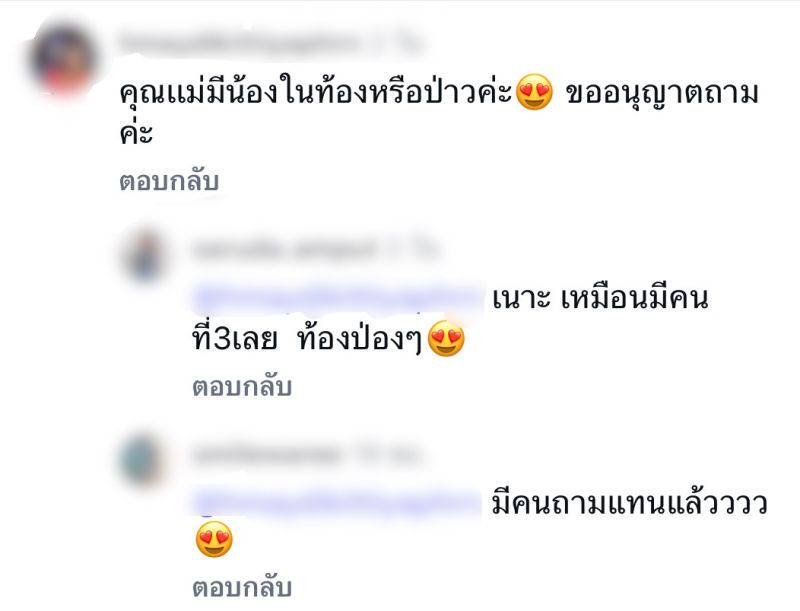 “หรือคนที่ 3 จะมาแล้วคะ?”, “คุณแม่สวยมาก ขออนุญาตถามนะคะ คุณแม่มีน้องรึเปล่าคะ”, “ขอแสดงความยินดีกับคุณแม่ยังสาวด้วยค่ะ”