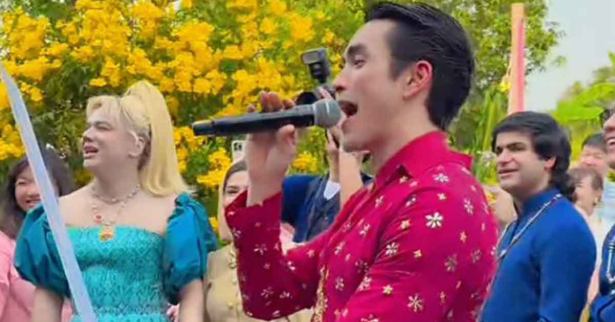 “ฮักเจ้าลืมผู้สาวทั้งแผ่นดิน บ่ให้ตาเหลียวเบิ่งไผ บ่ให้ใจไปฮักผู้ใด๋ ให้ฮักเมียผู้เดียว คือเก่า คือเก่าทุกมื้อ ให้เห็นเมียคือคนงามที่สุดในโลก งามกว่าดาราทั้งโลก” (รักเธอจนลืมผู้หญิงทุกคนในโลก ไม่มองใคร ไม่รักใคร รักเมียคนเดียวเหมือนเดิมทุกวัน และมองว่าเมียสวยที่สุดในโลกยิ่งกว่าดาราทุกคน) บอกเลยว่าสำเนียงเป๊ะ ความหมายปัง จนคนในงานกรี๊ดสลบในความคลั่งรัก ปิดตำนานคู่จิ้นสู่คู่ชีวิตอย่างเป็นทางการ