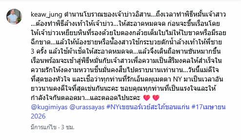 ควันหลงงานแต่งแห่งปีของคู่รักซุปตาร์ “ณเดชน์ คูกิมิยะ” และ “ญาญ่า อุรัสยา” เมื่อวันที่ 17 เมษายน 2569 ยังมีมนต์ขลังไม่เสื่อมคลาย! ล่าสุด “แม่แก้ว” สุดปลื้มใจ ออกมาโพสต์ภาพและข้อความผ่าน IG @keaw_jung เผยถึงเบื้องหลังพิธีกรรมโบราณที่หาดูได้ยาก นั่นคือการ “ล้างเท้าเจ้าบ่าว” ก่อนจะก้าวเท้าขึ้นเรือนหอเพื่อทำพิธีหมั้นหมาย โดย แม่แก้ว ได้อธิบายถึงกุศโลบายและตำนานความเชื่อของชาวอีสานไว้อย่างลึกซึ้งว่า