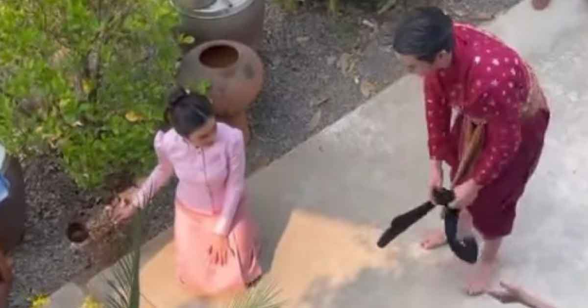 พิธีนี้ไม่ได้เป็นเพียงการทำความสะอาดร่างกายภายนอกเท่านั้น แต่ยังแฝงไปด้วยความหมายมงคลที่เข้มขลัง เพื่อเตรียมความพร้อมให้เจ้าบ่าวเป็นคนใหม่ที่สะอาดบริสุทธิ์ก่อนเริ่มต้นชีวิตคู่ รายละเอียดของพิธีนี้บอกเลยว่าไม่ธรรมดา เพราะเจ้าบ่าวต้องก้าวเท้าเหยียบลงบนแผ่นหินที่รองด้วย “ใบตองกล้วยเต็มใบ” โดยมีข้อแม้สำคัญคือใบตองนั้นต้องห้ามขาดหรือมีรอยฉีกขาดแม้แต่นิดเดียว! เพื่อเป็นนัยถึง