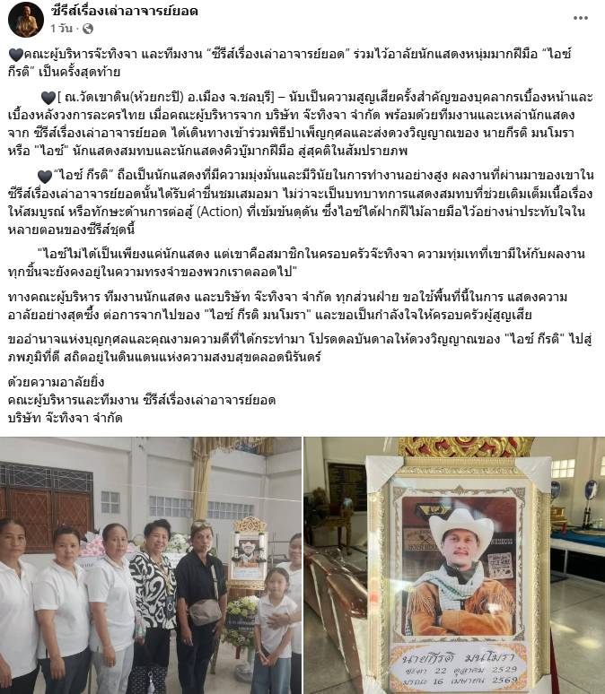 วันที่ 19 เมษายน 2569 ที่ผ่านมา เฟซบุ๊กซีรีส์เรื่องเล่าอาจารย์ยอด โพสต์ข้อความแสดงความอาลัยต่อการจากไปของ ไอซ์ กีรติ มนโมรา นักแสดงหนุ่มผู้ล่วงลับ โดยระบุว่า คณะผู้บริหารจ๊ะทิงจา พร้อมด้วยทีมงานและนักแสดงจากซีรีส์เรื่องดังกล่าว ได้เดินทางไปร่วมพิธีบำเพ็ญกุศลและส่งดวงวิญญาณเป็นครั้งสุดท้าย ณ วัดเขาดิน (ห้วยกะปิ) อำเภอเมือง จังหวัดชลบุรี