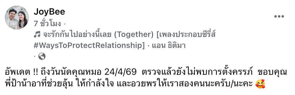 แต่ทว่าล่าสุดเมื่อวันที่ 24 เมษายน 2569 ทางเพจเฟซบุ๊ก JoyBee กลับต้องแจ้งข่าวที่ทำให้แฟน ๆ รู้สึกใจหายและรีบเข้ามาส่งกำลังใจให้ทั้งคู่ทันที โดยระบุว่าหลังจากที่เดินทางไปพบคุณหมอตามนัดเพื่อตรวจเช็กความพร้อมอย่างละเอียด กลับได้รับผลการตรวจที่ระบุว่า “ยังไม่พบการตั้งครรภ์” ซึ่งสวนทางกับผลตรวจเบื้องต้นก่อนหน้านี้ สร้างความผิดหวังให้กับทั้งคู่เป็นอย่างมาก แต่ก็น้อมรับความจริงด้วยหัวใจที่เข้มแข็งค่ะ