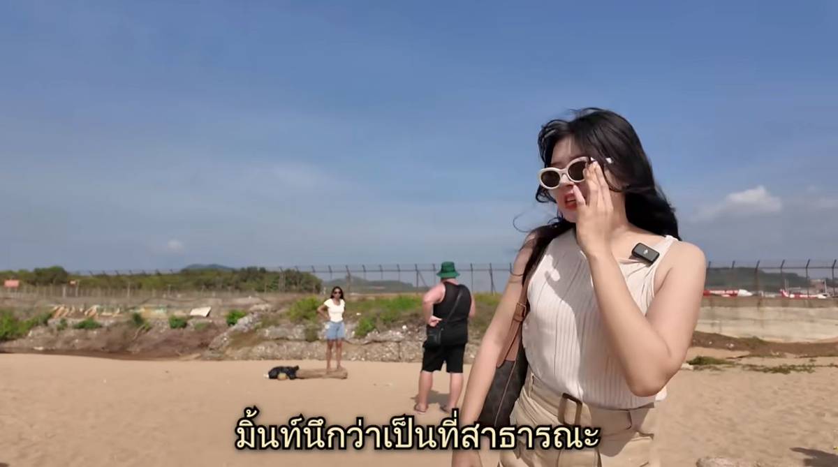 พร้อมพ่นประโยคสุดช็อกใส่หน้าว่า “Get out of our area.” (ออกไปจากพื้นที่ของเรา) แถมยังทำพฤติกรรมสุดมึนด้วยการใช้เท้าขีดเส้นบนผืนทรายเป็นวงกลมล้อมรอบตัวเอง เพื่อประกาศอาณาเขตแบบไม่เกรงใจใคร ทำเอา มิ้นท์ และทีมงานถึงกับยืนสตั้นท์ไปตามๆ กัน นาทีนั้นบอกเลยว่าความมึนงงพุ่งทะลุปรอท เพราะ สาวมิ้นท์ เองก็พยายามตั้งสติและตั้งคำถามกลับไปว่า พื้นที่ชายหาดแบบนี้มันคือพื้นที่สาธารณะที่ทุกคนมีสิทธิ์เข้าถึงไม่ใช่หรือ?